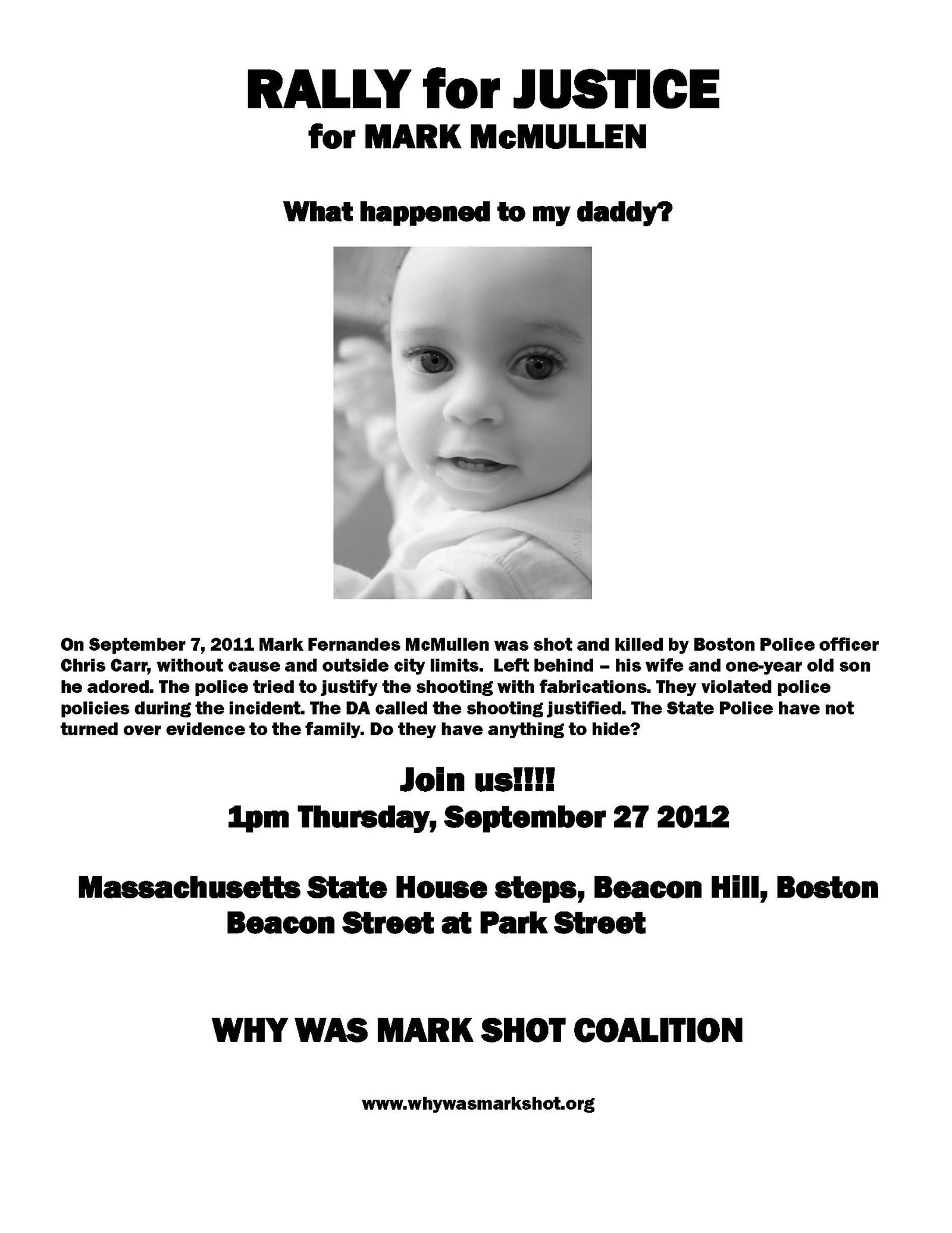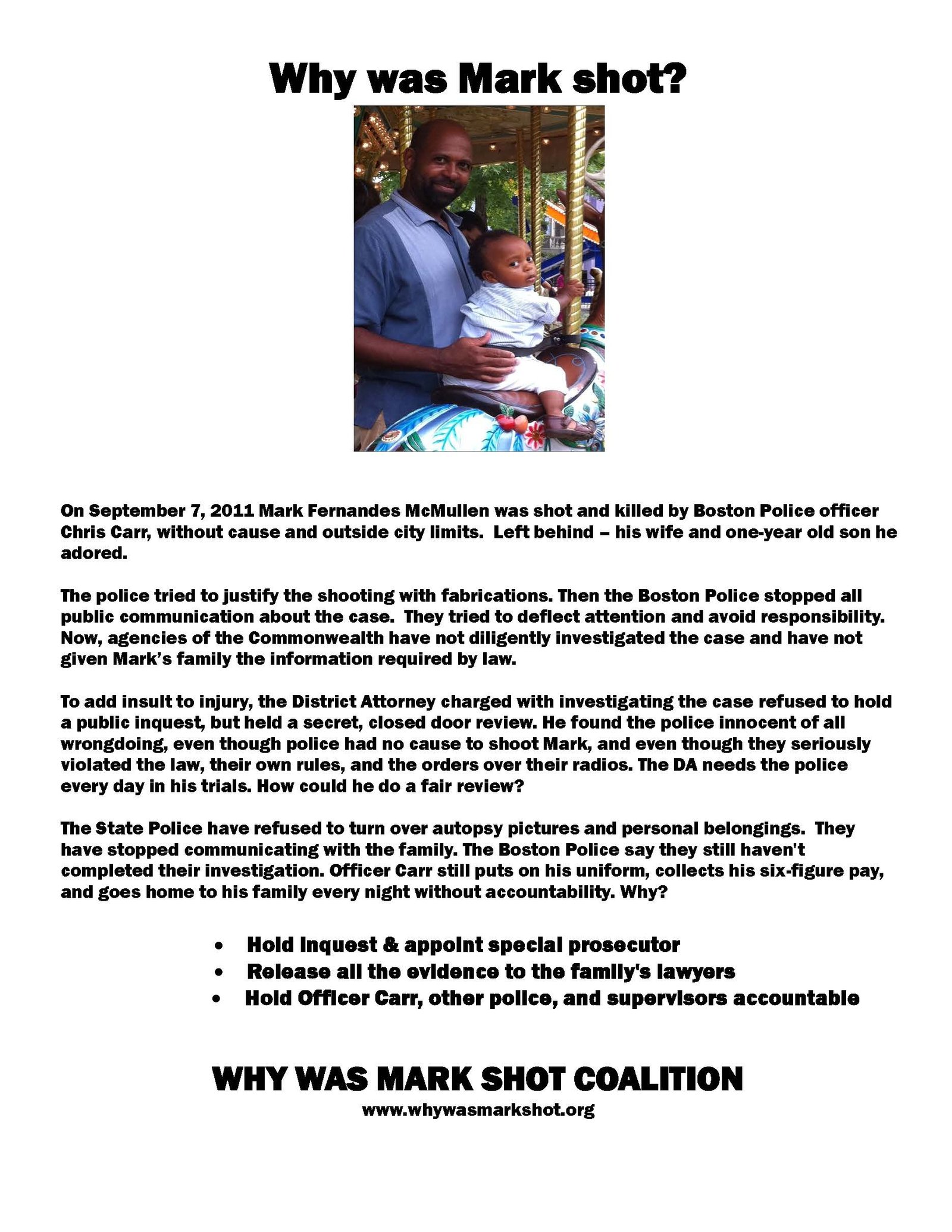 As you are probably aware, on September 7, 2011, Mark Fernandes McMullen was shot and killed by a Boston Police officer, outside city limits. Left behind were his wife and one-year old son.