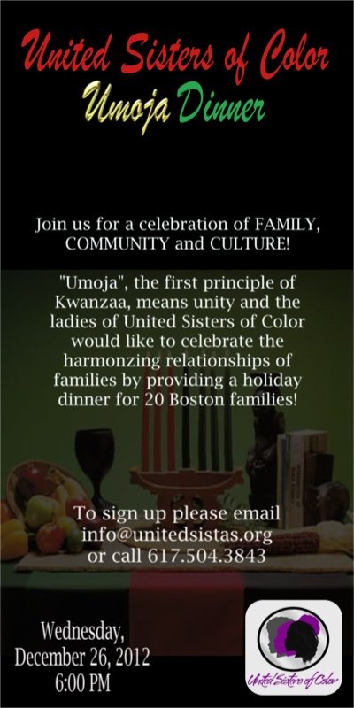 United Sisters of Color is giving back this holiday season! They will be feeding 20 Boston families in need. All families must preregister here: http://www.planetReg.com/E111041836226922
