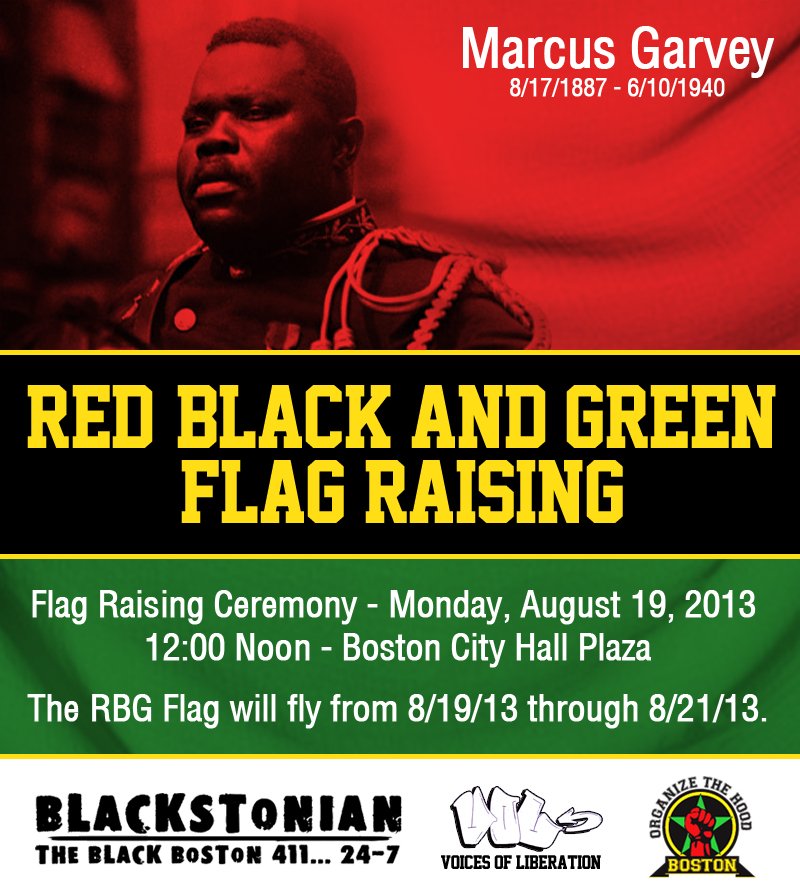 The Red, Black & Green Flag will fly from Mon August 19th until Wednesday August 21st at Boston City Hall Plaza – Government Center Downtown Boston.