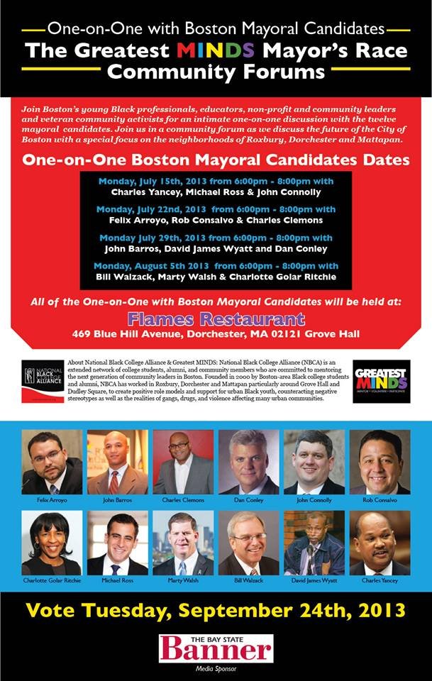 HERE IS THE CONFIRMED LINE UP for the One-on-One with the Boston Mayoral Candidates at FLAMES in Grove Hall: