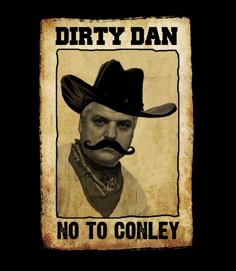 Dan Conley has issues. Due to his downright disrespect of our fine community he has been labeled as a desperado and dubbed “Dirty Dan” accused of playing dirty pool and dirty politics. If you see this fugitive from common sense remember he is NOT WANTED. DO NOT APPROACH HIM OR INTERACT WITH HIM IN ANY MANNER. Dirty Dan is a dangerous man and employs cunning and guile in his schemes to mislead innocent citizens. If Dirty Dan should happen to be seen in your neighborhood, lock your doors, hide your husbands, Dirty Dan is a mean old man.