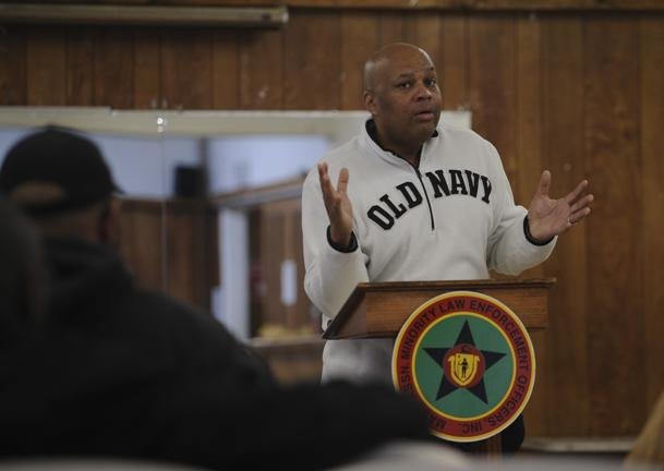Larry Ellison, president of the Massachusetts Association of Minority Law Enforcement Officers, leads a meeting at the organization’s headquarters in Dorchester.