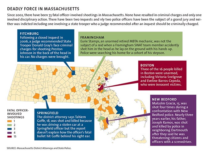 FROM THE TINY TOWN of Colrain at the Vermont border to the siren-pierced streets of Boston, state and local police have shot and killed 73 people across Massachusetts over the last 12 years. The deadliest year was 2013, when 12 people were killed. Every completed killing investigation found the police were justified in using deadly force; only three of the cases were presented to a grand jury or judicial inquest to determine if a crime was committed.