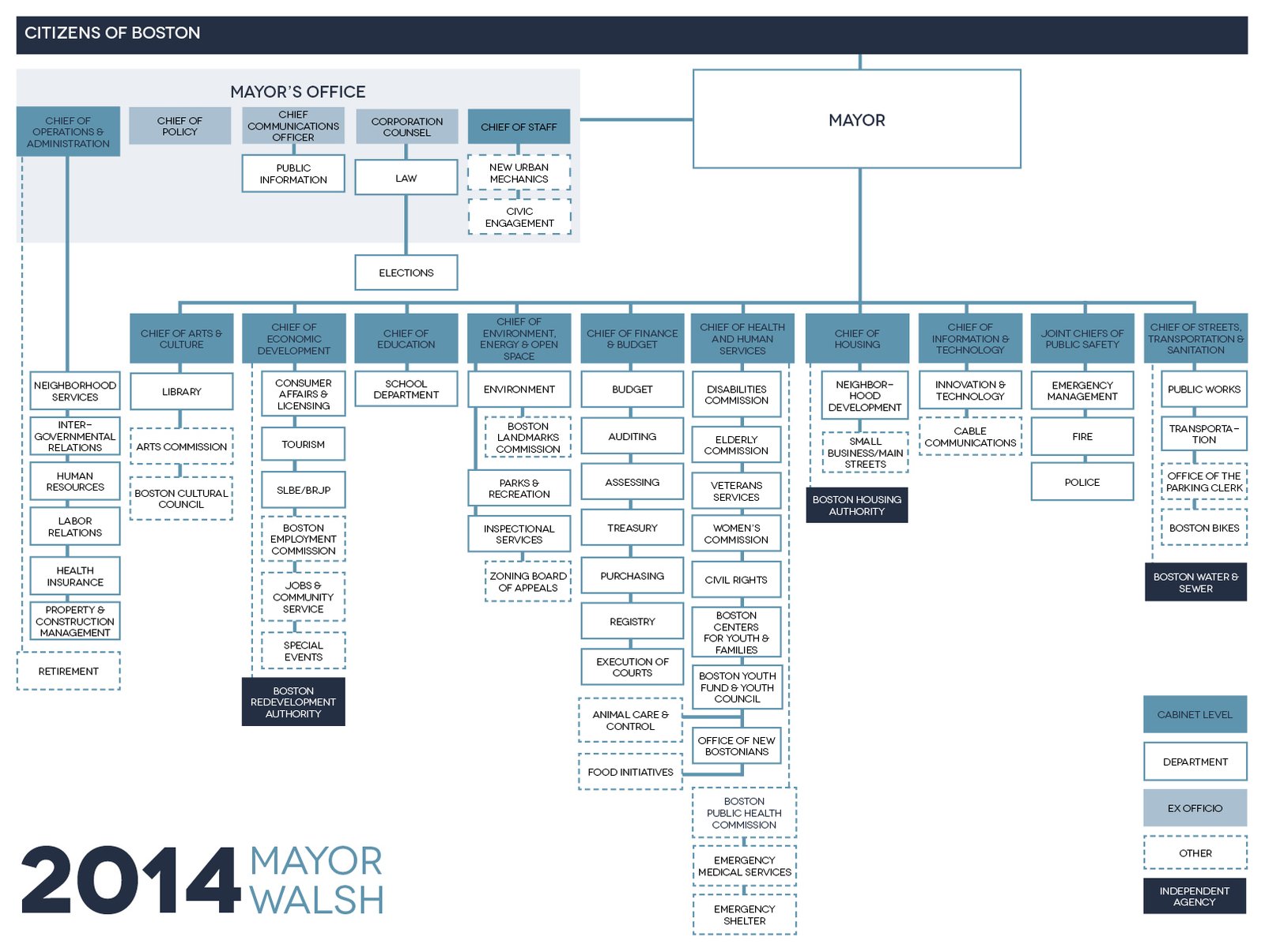 Mayor Marty Walsh has restructured the way that the City of Boston is organized. Mayor Walsh has created new departments/positions and consolidated others, along with new appointments, he has changed the status of some departments either removing or adding the departments to “cabinet level” positions. The organization chart graphic is a good start for citizens who want to see how the city’s power structure is organized.