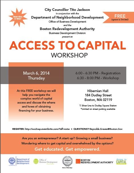 The Access to Capital Workshop will be held on Thursday, March 6, 2014 at Hibernian Hall in Dudley Square located at 184 Dudley St, Boston, MA 02119, MA at 6:00pm .