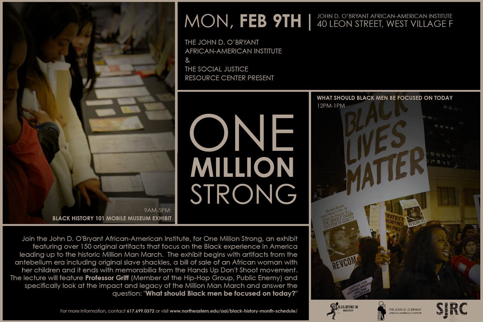 The exhibit is called One Million Strong (The Legacy of the Million Man March). The topic of the lecture by Professor Griff will specifically look at the impact and legacy of the Million Man March and answer the question: “What should Black men be focused on today?”